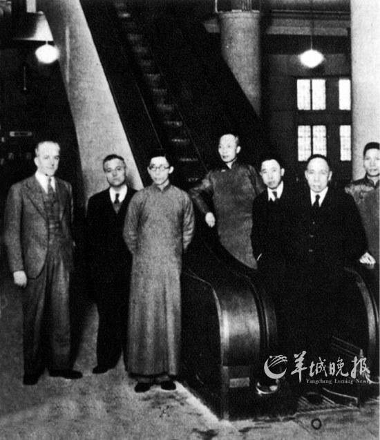 中国第一部手扶电梯安装在上海市南京路大新公司内,上图为1936年蔡昌(前排右二)与同事们在大新百货公司电梯旁合影。