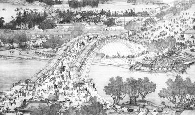 “宋本”画中隐藏着对现实社会中一些隐患的忧虑:他将船与桥的矛盾和桥上文武官员的矛盾交织为全卷的视觉中心,通过表现船桥险情等诸多场景,深刻揭示出当时的社会痼疾。“明清本”,更多地表现其乐融融的官民生活和繁华的商贸活动。上图依次分别为“宋本”、“明本”、“清院本”《清明上河图》虹桥段场景。资料图片