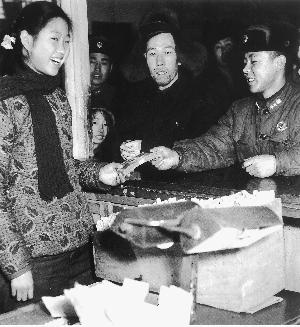 雷锋一个月只有6元津贴,平时舍不得乱花一分钱。1960年初秋,他得知部队驻地望花区和平人民公社成立,便慷慨地从银行取出自己的200元积蓄,准备送给公社。季增抢拍了这个场景,但洗照片时发现,刚好赶上胶卷的最后一张,是个半拉照,底片上只有营业员,没有雷锋。作者后来补拍了这张照片。
