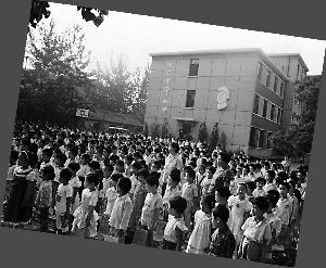 ④雷锋小学命名后,师生在操场上举行升旗仪式。