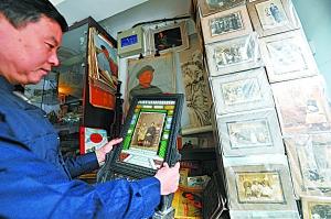琉璃厂东街乙9号小店内,悬挂着很多老照片,标价均在600元以上。郭老板手中的装框旧照片,标价为4500元。 实习记者 和冠欣摄