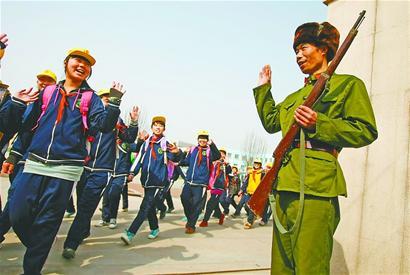 学生家长宋延富穿着“雷锋服”站在黄台小学校门前