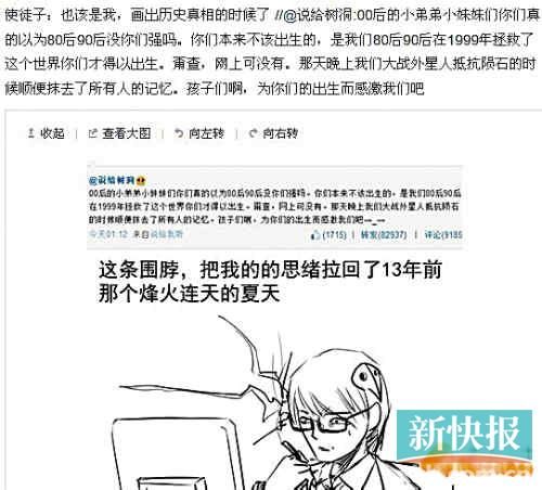 网友纷纷以“1999战记”为话题标签,为“那一年”的“惨烈”添油加醋:“不提了,提多了全是泪。隔壁家王X那年才八岁,他是我的战友,我的兄弟……”“作为一名三流特工,当年我担当了卧底的任务。那真是一次恢弘的战役啊。”
