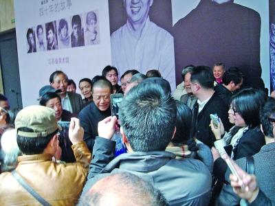追星一般的疯狂场面,也出现在陈丹青与老友南京办展现场。昨日,“四十年的故事——林旭东、陈丹青、韩辛画展”在江苏省美术馆揭幕。开幕式一结束,陈丹青迅速落入人群的包围。他像一个巨大的漩涡,走到哪儿,哪儿就裹挟起拥挤的人流。展览大厅人头攒动,求合影求叙旧的粉丝没个完。这之中,有不少人来自当年他插队的江浦,“在江浦我们一起工作过的,到现在他还记得我,心情激动,我们是他的粉丝啊。”一中年人幸福地说。与故人相逢在画作面前,陈丹青也有些激动,“我想回到那个青春岁月”,他说。 扬子晚报记者 冯秋红 文/摄