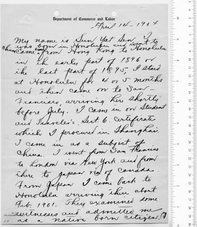 众所周知,孙中山于1866年出生于广东香山县翠亨村,为什么他声称自己出生在美国?朱晓秋介绍, “20世纪初,孙中山在当地侨领的协助下,取得了夏威夷的出生证明,获得美国籍。1904年,孙中山从檀香山赴美国,为了阻止孙中山入境,清政府向美国举报孙中山的护照有问题,孙中山上岸后,被美国官员审问,他写下了展出的这份“自述证言”。