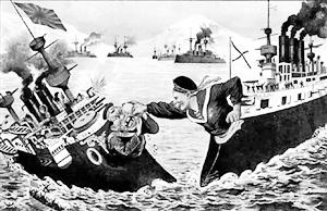 △日俄旅顺口战役的漫画中可见日、俄两国海军军旗。