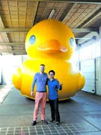 本报记者与“大黄鸭之父”霍夫曼(左)在迷你版的大黄鸭前合影。