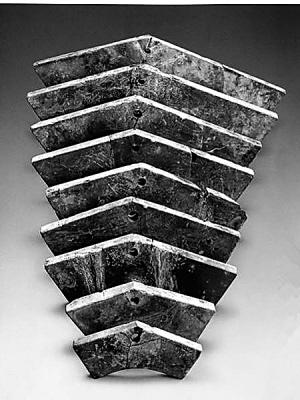 图5是狮子山楚王汉墓出土的石磬,共19件,石灰石质地,皆素面。有些磬尺寸相同,其中有9件尺寸大小依次递减,即下面的这套编磬。演奏时,编磬按一定的音阶被分散悬挂于磬架上,每磬可发一音。演奏者坐在磬架后,双手各持一槌,以槌击磬上角,可单击,也可双击、轮击。