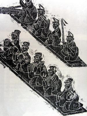 第三组是鱼龙曼衍之戏。有走绳的、装扮龙的、装扮鱼的、装扮豹的、装扮大缺的,共五种。另外还有三个奏乐者坐在一条长席上,为表演者伴奏。