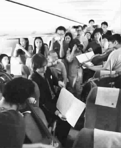 前天下午,从北京飞往澳门的航班延误起飞,乘客们在等待的时候,耳畔突然飘起的乐声,顿时一扫烦闷的心情。原来,费城交响乐团结束了北京的演出后,正搭乘该航班前往澳门继续中国巡演,见客舱内气氛沉闷,4位乐手便在狭窄的过道里摆开架势,当场演奏弦乐四重奏。