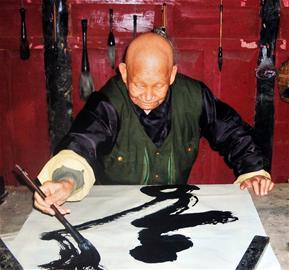 昨日,蒋信平的弟子潘重清重回师父书房,指着一张两三米长、一米来宽的长方桌感叹道:“师傅每天上完早课,练完武术过后就要练书法。”在潘重清记忆中,蒋信平练书法是他的一种修为,而他练字的兴趣之浓厚,是“兴趣来了,挡都挡不住”。“住院之前几天,他还写了五六幅大字。”潘重清从书房一角翻出一张一米多长的书法,上面白底黑字,一个“须”字刚劲有力,占据整个纸面大部分但却没有落款。“这是师父写的最后一个字。”潘重清语气低沉下来,他回忆,5月中旬一天上午10时许,今年已经入院一次的蒋信平提出要练书法。他“像个年轻人一样”站在书桌边,提起半米来长的玉石笔,袖子一如往昔般高高挽起。虽然提笔重、写的是大字,但他写字的速度依然飞快,“写一个字只需要几分钟。”