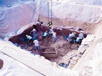 图为:考古工作人员正在清理墓葬