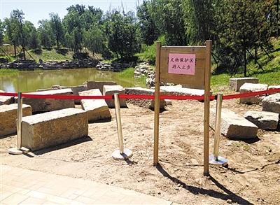 昨日,记者在圆明园廓然大公西边看到,规月桥出土的桥体构件被堆放在新建起的红色木桥旁,桥边是河道。该区域处有红色警戒线,一个写着“文物保护区,游人止步”的牌子立在一边。据相关负责人介绍,这些构件都是从河道里打捞出来的,警戒线一直都有。