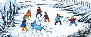 《周礼·天官·凌人》载:“凌人,掌冰。正岁,有十二月,令斩冰。”这里提到的“凌人”,就是周王任命的专门掌管取冰、藏冰与用冰事务的官员。每年农历十二月到正月(正岁),在凌人监管下,“冰者”(奴隶)被带往深山溪谷或江河冰面上凿取冰块。当时,凌人还有数量不小的属下,包括下士2人、府2人、吏2人、胥8人、徒80人,已形成一个庞大的管理机构。周代以后,各朝都有专职“掌冰”的官员,分别是“凌室长”、“凌室侯”、“冰井使”等;北宋甚至专门设置“藏冰署”,后改为“冰井务”。而采冰所役使的对象,西周是冰者,唐代则由专门的“采冰户”负责。宋代采冰,则是“役兵”。