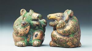 熊在汉代被视为吉祥的动物。汉代工艺家颇善塑熊,这套鎏金熊形青铜镇(1952年在合肥出土,目前在国家博物馆展出),把肥胖的熊处理得憨厚可爱,为汉代较单调的室内布置增添了活泼气氛。