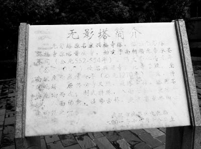 虽然这是官方的说法,但记者发现,关于宝塔的来历,也有一些其他的说法。据《湖广通志》记载:“古无影塔在黄鹄矶石上。”《江夏县志》也载:“古无影塔在黄鹄矶石上,高不三尺,每日返照略不见影,藏骨名不知谁何也。”所谓无影,一说为无论太阳在何处,该塔身后均无影子;一说为冬至正午无塔影。