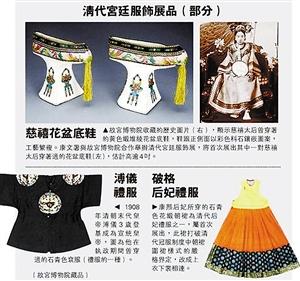 香港历史博物馆下周三(31日)起举行香港历来最大型清朝宫廷服饰展览,展出逾130件故宫服饰精品,有三成展品更属首次展出,包括昔日慈禧太后所穿的高逾4寸“花盆底鞋”,以及末代皇帝溥仪年少曾穿着的礼服等。