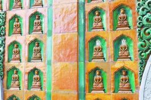 除了图片中呈现的两尊佛像外,外墙上还有另外6尊佛像头部也不见了,只剩下灰色的水泥轮廓。其余佛像也存在不同程度的损毁,有的少了鼻子,有的不见了手中的宝瓶。记者在现场看到,这8尊“断头”佛像所处位置均在墙体中部,离地面约有3米高,正常成年人伸手无法触及。