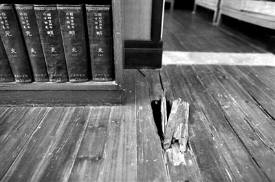 记者看到,文库门口一处地板已经被踩裂,现出一豁口。“这一片都不能踩,地板由于受潮里面已经腐烂了,容易断裂。”郭丽娜说。