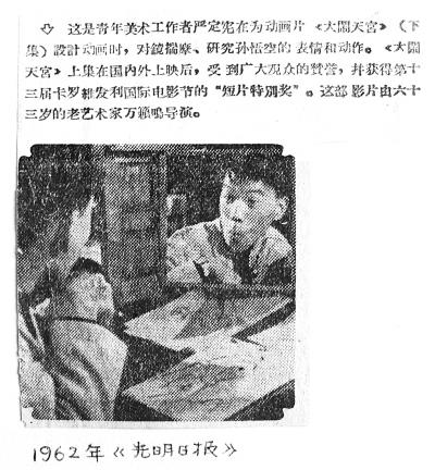 当年,《大闹天宫》的动画设计组每人桌上一面镜子,对着镜子揣摩表情、口型的变化。1962年,《光明日报》刊发了严定宪的工作照,这张剪报严定宪一直收藏至今。本报记者 颜维琦摄