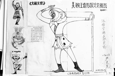 严定宪为《大闹天宫》设计的孙悟空形象。左侧三种造型为著名装饰画家张光宇先生所设计,严定宪的设计系在此基础上重新修改。本报记者 颜维琦摄