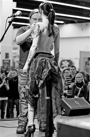 2013年3月22日,在德国法兰克福举行的第21届国际文身大会上,文身技师在模特身上进行彩绘。新华社 发