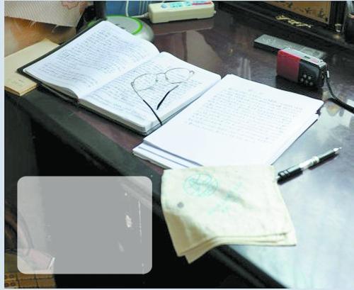 这是孙方友离开书桌前的情形:眼镜、手绢、笔记本、笔、还有未能完成的最后一部小说《戴仁权》。