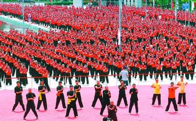 在烈日的炙烤下,背景音乐气势磅礴,5000多名穿着红色统一服装的爱好者同时表演,场面壮阔。据介绍,这些咏春爱好者有80高龄的健壮老人,有6岁的儿童,更有来自美国华盛顿的叶准的洋徒弟杰夫·埃尔金。 (李细华 李晓玲 摄影报道)