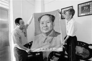 陈汉章特别向记者展示了两幅绣有毛主席画像的巨型毛毯。一幅画像上写着“伟大的导师、伟大的领袖、伟大的统帅、伟大的舵手,毛主席万岁!”等字样。另一幅巨型毛主席画像由“中国杭州织棉厂制”,上写“毛泽东同志”等字样,下边还有“MADE IN CHIAN”等英文。他说,第一幅毛毯是“文革”时期的产物,当时每逢遇到重大节日,两个人抬着这幅毛主席画像走在队伍的最前面,后面跟着敲锣打鼓、载歌载舞的人群。后一幅毛主席画像有英文,是用于出口到友好国家的。“这是我们这一代人亲身经历过的,这是历史的见证。”