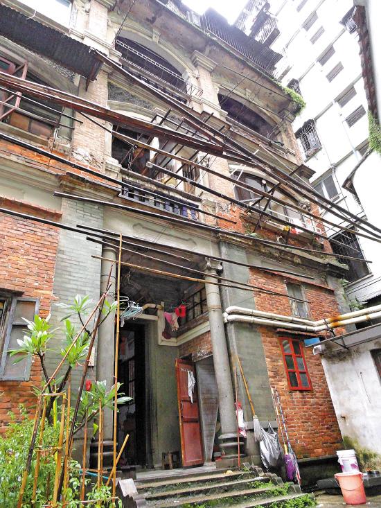 张姨向记者介绍,以前屋内都是以木屏风做间隔,大院还有一块历史价值很高的石碑,但后来都不见了,门前有两根石柱的平台是他们小时候经常玩耍的地方,也是这处骑楼的特色标志,现在都被隔成住房了。张姨说,屋内还有一道“走火梯”,设计相当完备,被保留下来。