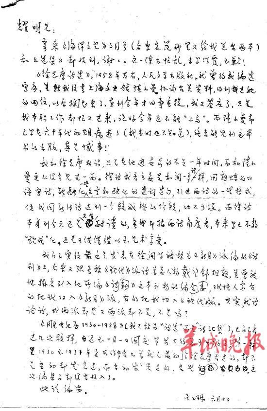 上世纪七十年代末与八十年代初,笔者写《当代中国作家风貌》和编卞之琳的《雕虫纪历》(香港三联书店繁体版),与他交往较多。最近整理与他来往的信件,共有近二十封之多。其中不乏逾千字的长信。他的字很像巴金的字,像一尾尾小蝌蚪,有点潦草,但细辨之下,还是分明可读的。