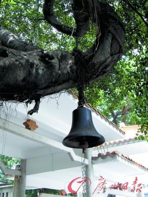 图为悬挂在念祖亭东面的1891年古钟。钟高58厘米,口径宽42厘米,由青铜铸成。以前钟的表面还有“方便医院”四个字,由于岁月久远现已模糊,但仍能看到上刻“1891”的数字。