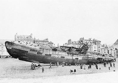 一艘德国的SM U-118潜水艇被拖到英国岸边,摄于1919年