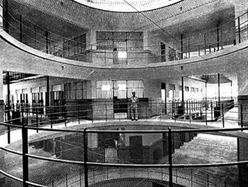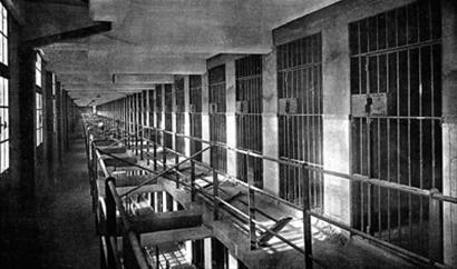 正如那句俗语所云:“罗马不是一天建成的”,提篮桥监狱在落成后的数十年里,至少经历3次以上的改扩建,才基本达到如今的规模。1929年,著名作家阿英在租界被捕,一度关押于提篮桥监狱。据他回忆,那时的提篮桥监狱有东西南北4座监楼,“每监是五层,每层背靠背建筑两排房间,每排间数约有40个,每间少则收3人,多则收4人。每间占地宽四尺,长八尺,三面墙,一面铁栏——铁栏边就是门。 ”“从铁栏到狱窗约有一丈五尺左右,用中国式的跑马楼的建筑形式,中间是天井,可是这天井看不到天,上面是有屋顶的,而且每层天井是用铁丝网平兜了,以免犯人跳楼寻死。 ”囚牢里生活虽不免“挨饥忍饿,甚至于水都不能多得一点”,但阿英还是保持着革命乐观主义精神。在他看来晚饭后的一两个钟头之间是狱中生活最惬意的时候。 “那时早班的西捕是全退去了,晚班的还没有来,只有印度阿三(即印籍看守)在守着。我们在这时,可以说是很放肆的,唱歌,说故事,唱戏,唱小调,做政治报告,一切都是自由的……”