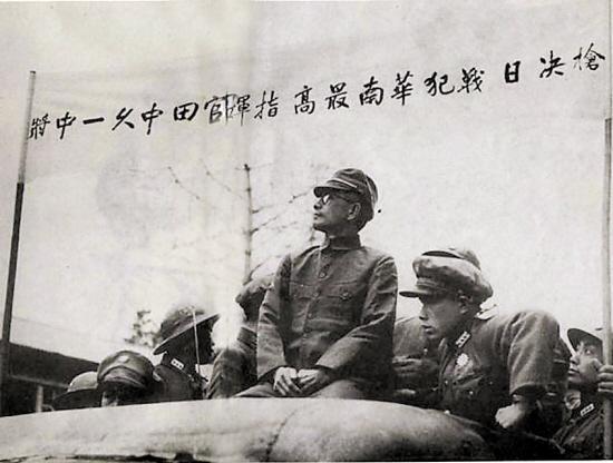1947年3月,广州审判战犯军事法庭接到南京政府寒文(36)防吕甚字第4578号代电,核准执行田中久一的死刑判决。3月27日下午,押解田中久一游街示众的卡车上,白布横额上书“枪决日战犯华南最高指挥官田中久一中将”,田中久一戴手铐脚镣坐在车上。