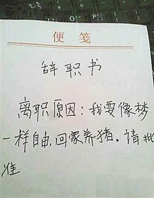 近日,有网友曝出浙江杭州一位保安的辞职信,感慨太文艺了!全文如下:我要像梦一样自由,回家养猪,请批准。这一辞职信在网上曝光后迅速引起网友关注,不少网友赞赏该保安的辞职信尽显文艺范,也有为其“走自己的路”的勇气喝彩的,更有网友为此感慨:人生,再不疯狂,真的就老了。
