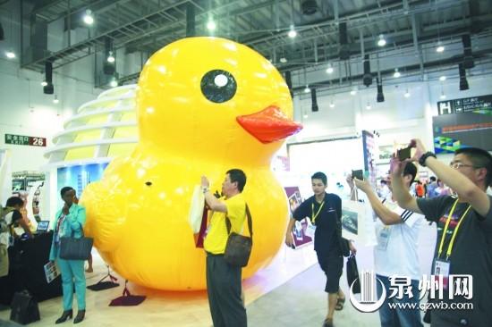 昨日,旅博会展馆内展出一只山寨版大黄鸭,这只大黄鸭高约3米,大人站在它的旁边都跟来自小人国一般。