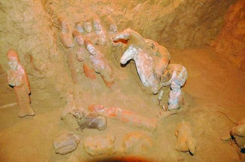一位不愿透露姓名的考古人员告诉记者,该墓陪葬品很少,多为常见的陶俑(左下图),没有金银玉器等奢华陪葬品。陕西省考古研究院助理研究员耿庆刚表示,最为奇特的是墓室中没有发现棺椁的痕迹,更没有发现完整尸骨。