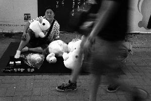 昨天傍晚,在地铁望京站外,一位妇女在摆地摊销售盗版大黄鸭。自从正版大黄鸭落户北京园博园后,这只可爱的鸭子就成了京城人关注的话题。(晨报记者 王巍/摄)