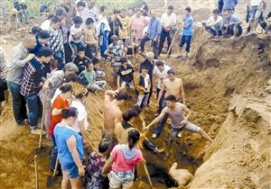 几十名村民在河南驻马店的一处南水北调工程工地上挖掘古钱币。