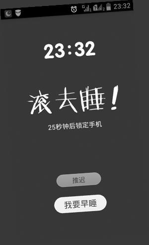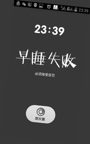 这条网友“弗车车”发布于国庆长假期间的微博,让一个名为“我要早睡”的手机软件,一下子成为网友关注的焦点。“弗车车”表示,自己偶然下载了这款软件,然后设定了晚上11点半的睡觉时间。时间一到,软件就开始提醒他睡觉,点击“推迟”几次后,没想到,软件把他手机上的所有应用都“锁”住了。这让“弗车车”大吃一惊,他点击“放弃早睡”按钮,结果,软件居然帮他自动发布在微信“朋友圈”上:“连早睡早起都做不到,我还能干成什么?!鄙!视!我!自!己!”