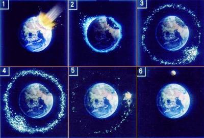 撞击说:目前获得了大多数学者的支持。在太阳系形成早期,大约在相当目前地月系统存在的空间范围内,形成了一个质量相当于现在地球质量9/10的“原地球”和另一个火星大小的天体“原月球”。由于这两个天体相距不远,因此有机会发生碰撞,不仅使“原地球”的自转产生了偏斜,而且使“原月球”碎裂,一部分被“原地球”吸积并变成了地球的一部分。另一部分飞离的气体尘埃物质受地球引力的作用,呈盘状分布在洛希限以外的空间,它们通过吸积,先形成一些小天体,然后像滚雪球一样不断吸积增长,最终形成现在的月球。(兵哥)
