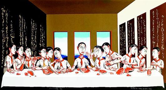 网络上,也有一些网友提出看不懂《最后的晚餐》,不过是一群带着红领巾的人在吃西瓜。邢媛媛说,《最后的晚餐》是曾梵志最具标志性的“面具系列”的晚期作品。创作于2001年,取材于达芬奇的同名作品,以恢弘的气势捕捉了中国社会在上世纪90年代经济改革时期的面貌。“他们在相同的红领巾面具下,却有不同的表情,奉承、恐惧、眼红……带有鲜明的时代烙印。”