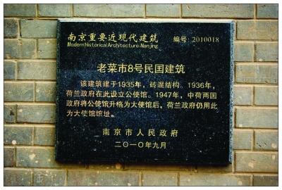 “其实这是民国时期的荷兰大使馆。”家住附近的刘学清老先生告诉扬子晚报记者,这处建于1935年的荷兰大使馆原馆舍占地7068平方米,建有砖木混凝土结构的荷兰式楼房9栋,其中三层1栋12间,二层1栋8间,西式平房7栋16间,简易房1间,共计37间,房屋建筑面积1019平方米。但是现在只剩下二层1栋8间。该馆舍为大屋顶建筑,外观虽然有些斑驳,但保存尚属完好。在被列入省文保单位前,被作为南京三乐电子信息产业集团有限公司进出口分公司的办公用房和仓库用房,而现在因为年久未修缮而显得破败。