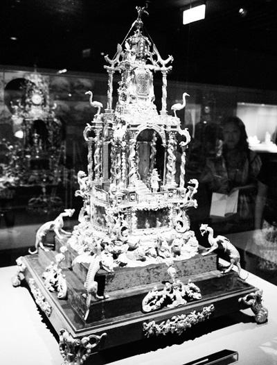图为来自北京故宫博物院的文物“英国18世纪铜镀金转人亭式大钟”。 新华社记者 鲁 鹏摄