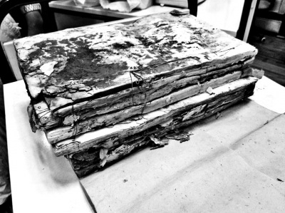 书叶上密布着洞孔虫蛀鼠啮炭化严重