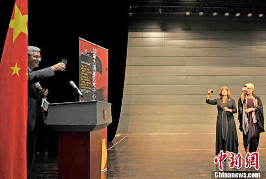 10月13日,中国与加拿大建交43周年。当晚演出前,加拿大驻华大使赵朴(Guy Saint-Jacques)先生在天津大剧院与加拿大国家艺术中心交响乐团访华巡演的成员一起举杯庆祝。中新社发 佟郁 摄