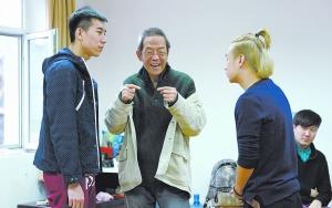 昨天,话剧《一鸟六命》排练现场,导演林兆华(中)在指导演员表演。 本报记者 和冠欣摄