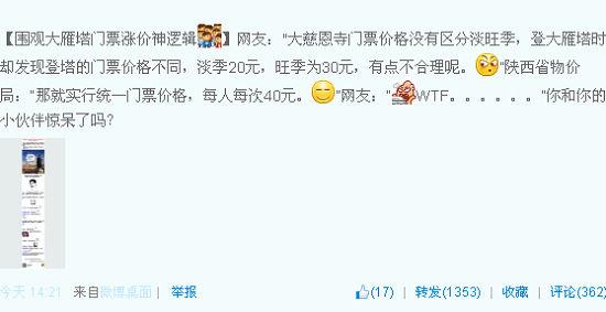“大慈恩寺门票价格没有区分淡旺季,价格统一为每人每次50元,同一个景区,进入到大慈恩寺后,一些游客要登大雁塔时却发现登塔的门票价格不同,淡季20元,旺季为30元,一些游客反映这样不合理。”今天(10月17日),有媒体报道称,针对游客反映,“陕西省物价局经过调研,同意西安市大雁塔保管所取消大雁塔淡旺季门票,实行统一门票价格,具体标准为每人每次40元。”