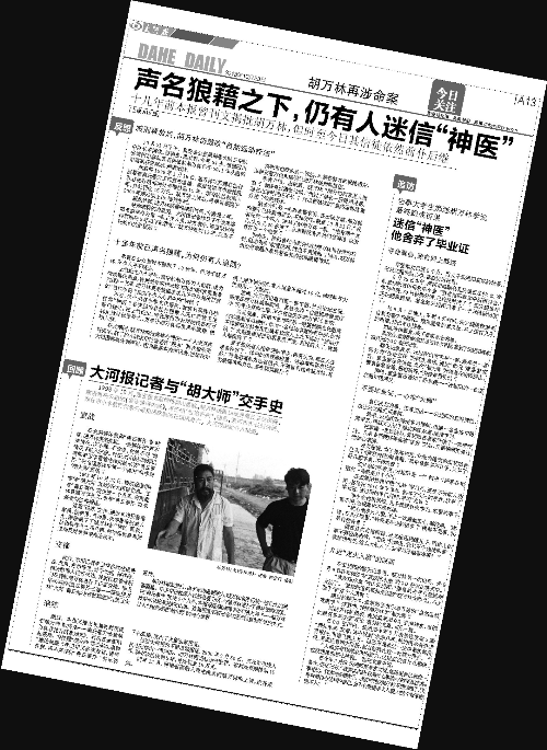 1998年,摆下“鸿门宴”的“胡大师”与本报记者“斗酒”时,没想到自己会因非法行医致死人命而入狱13年。“胡大师”也不会想到,自己通过大河报的连续报道而重回公众视野。 (资料图片) 记者 闫化庄 摄